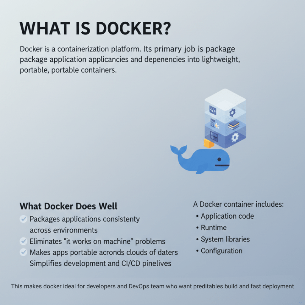 Docker is a containerization platform. Its primary job is to package applications and their dependencies into lightweight, portable containers.