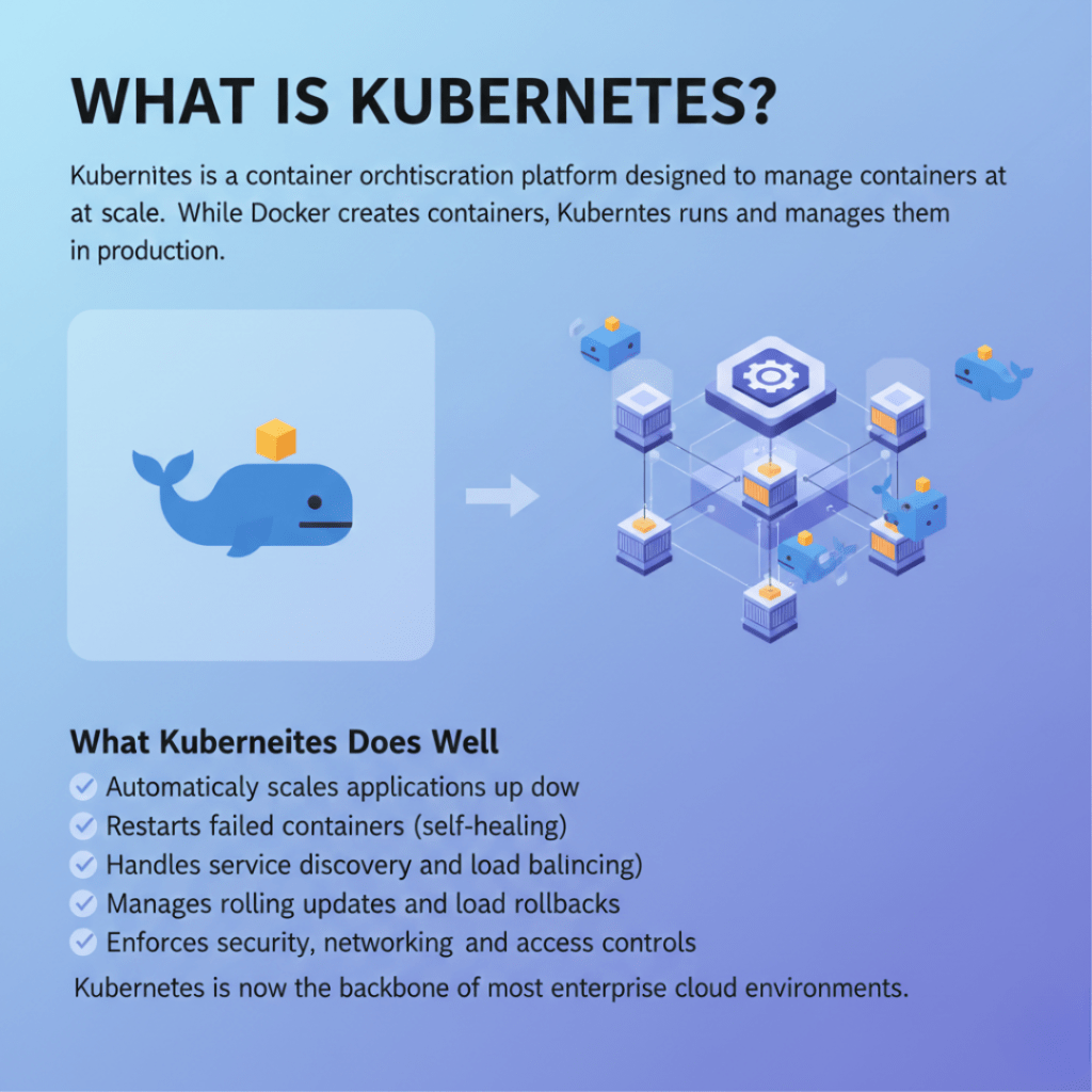 For example, an e-commerce platform during a Diwali or Black Friday sale can auto-scale Kubernetes workloads to handle traffic spikes — something Docker alone cannot do reliably.